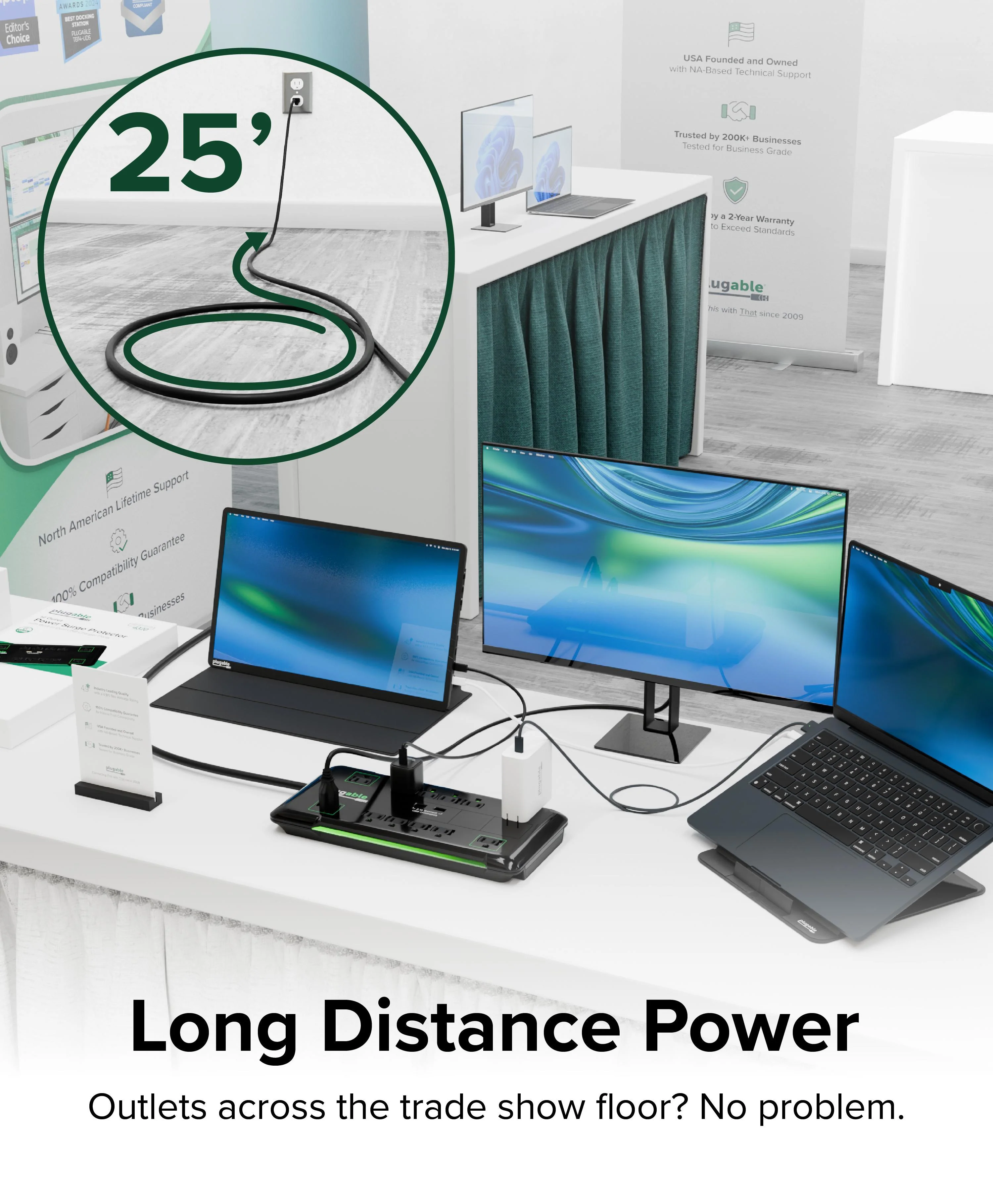 Plugable 12-Outlet Power Strip with 2-Port USB Charger (25ft/7.6m Cable)—
