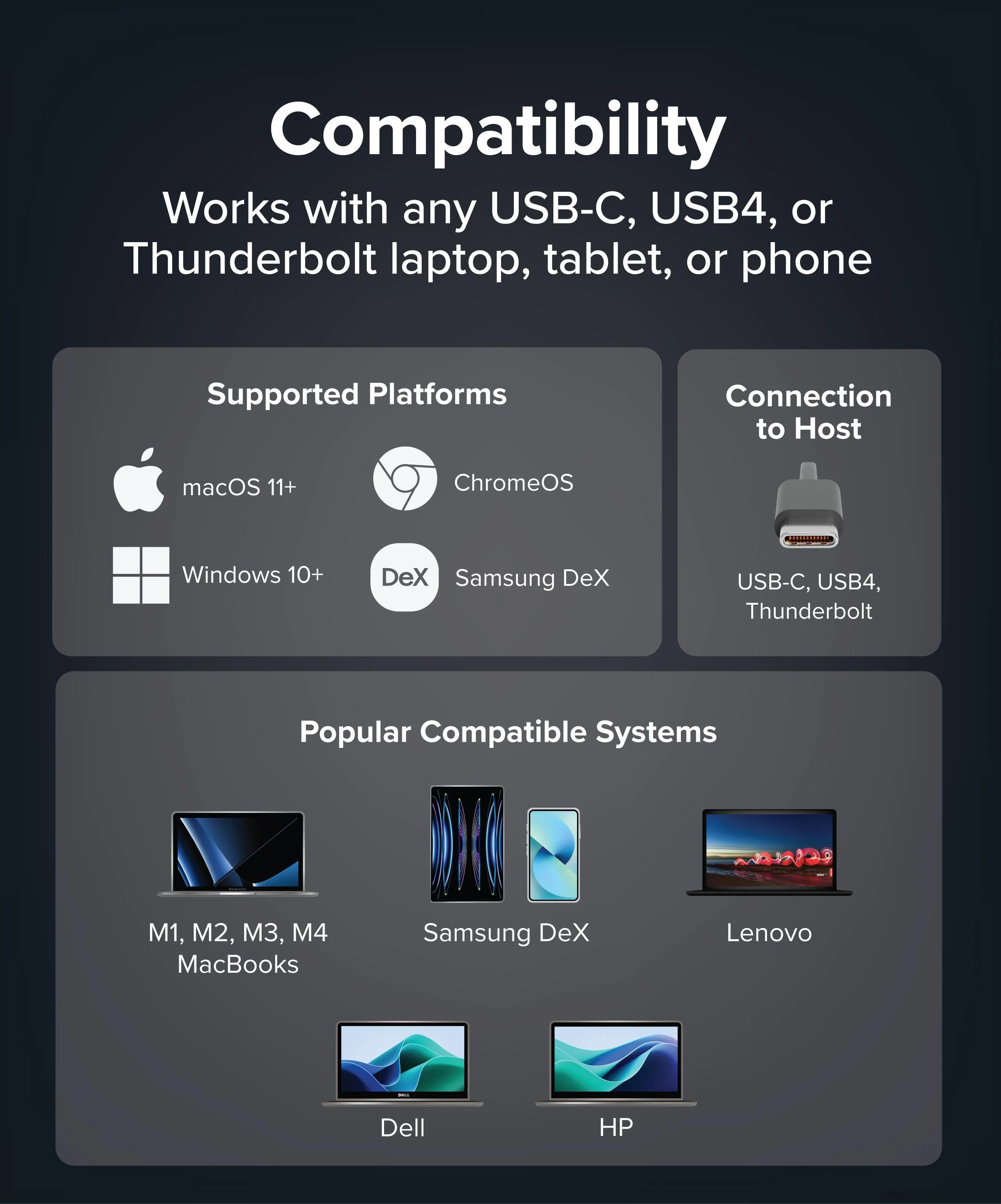 The portable docking station UD-CUBE is compatible with USB-C and Thunderbolt 3 equipped Windows, Mac and Chromebook systems that support Alt Mode video and acts as a port replicator stations multiple devices. Please see the System Requirements below for more details about exceptions.