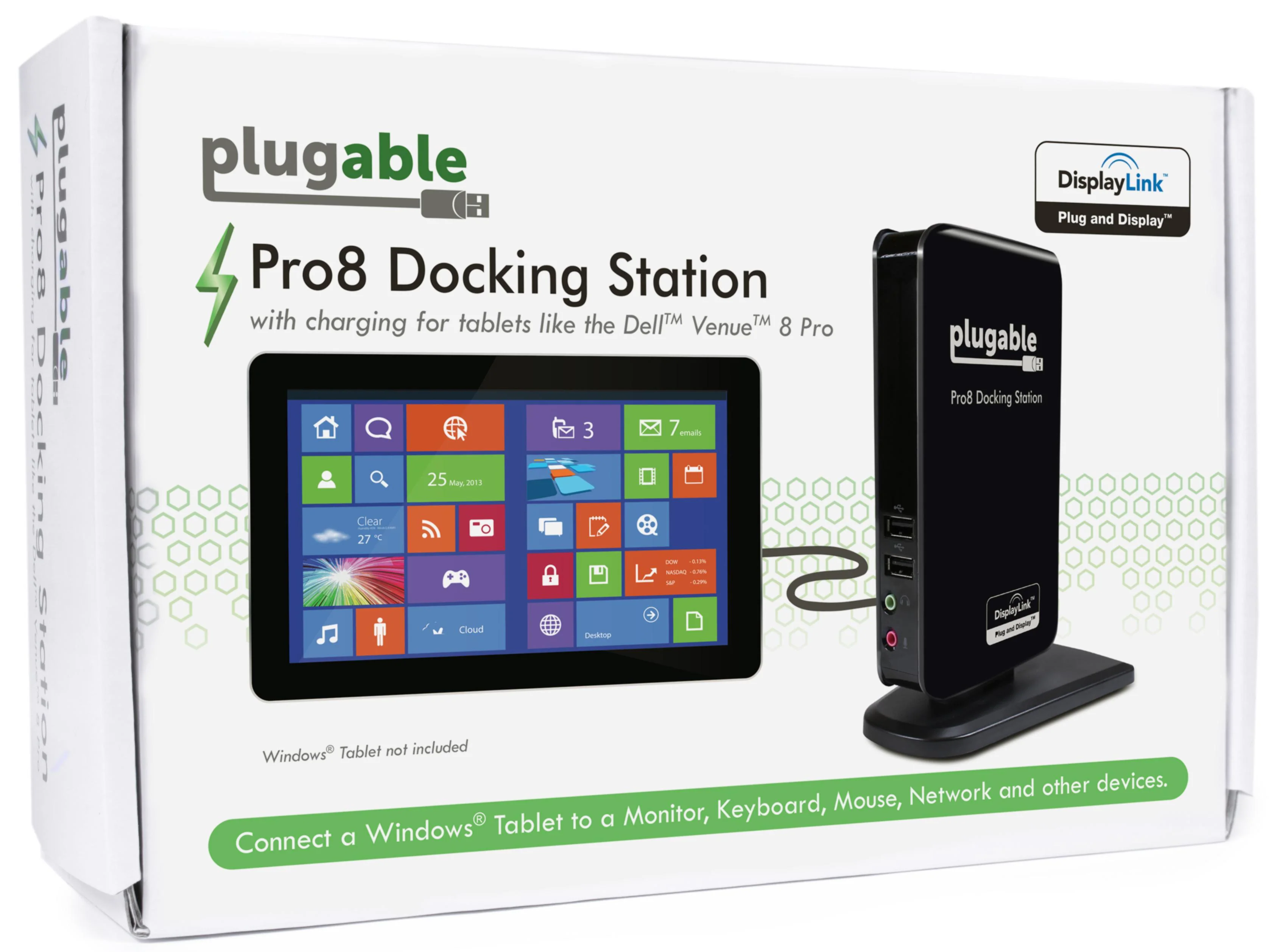 To solve the inability of the Dell Venue 8 Pro Windows tablet (and more) to charge and connect external USB devices at the same time, we created the Plugable Pro8 (UD-PRO8) docking station as a Kickstarter. Thanks to our backers, the project was successfully funded July 2014.
