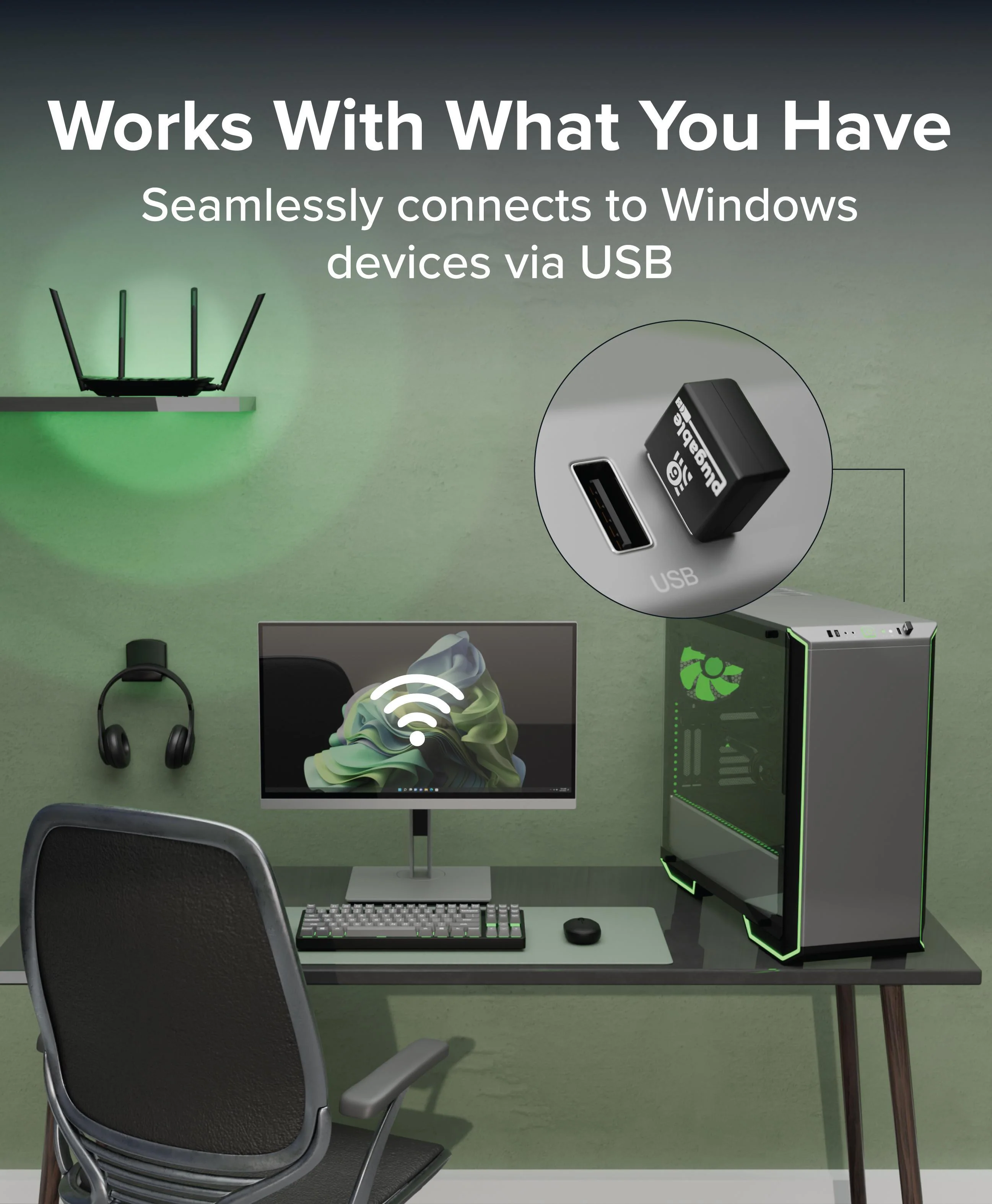 The compact design stays inserted without blocking adjacent ports and is well suited to everyday browsing, meetings, and streaming. On tower PCs, a front USB port can improve reception; a short USB extension (not included) can help reduce interference and improve stability.