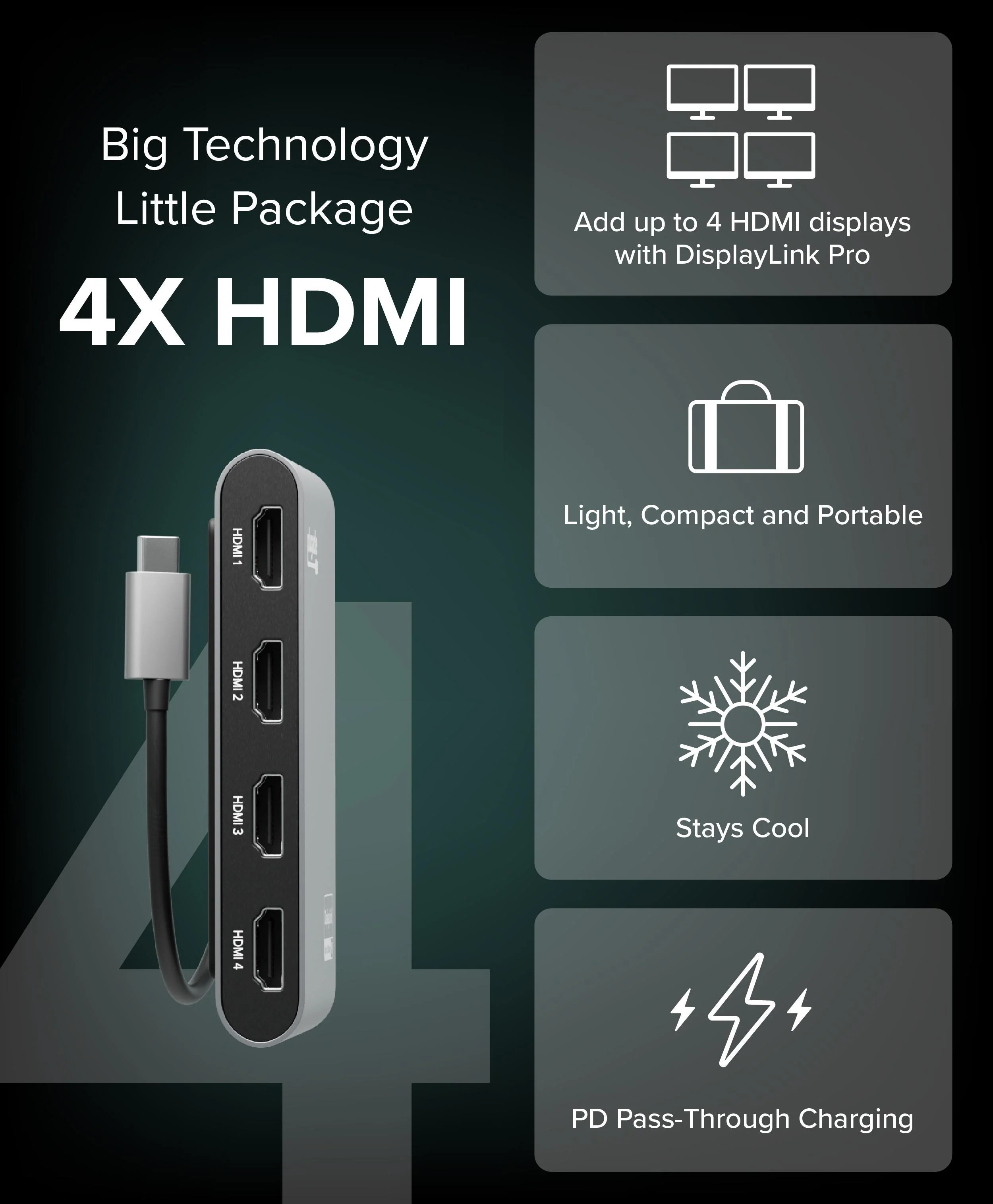 Key features include 4x 4K 60Hz HDMI pots, DisplayLink-powered (diver required) for wide compatibility, 90W pass-through power delivery, and a bus-powered design. This adapter is a versatile solution for any environment requiring multiple screens, from high-performance office setups to work-from-home stations, offering a seamless and efficient way to boost productivity.